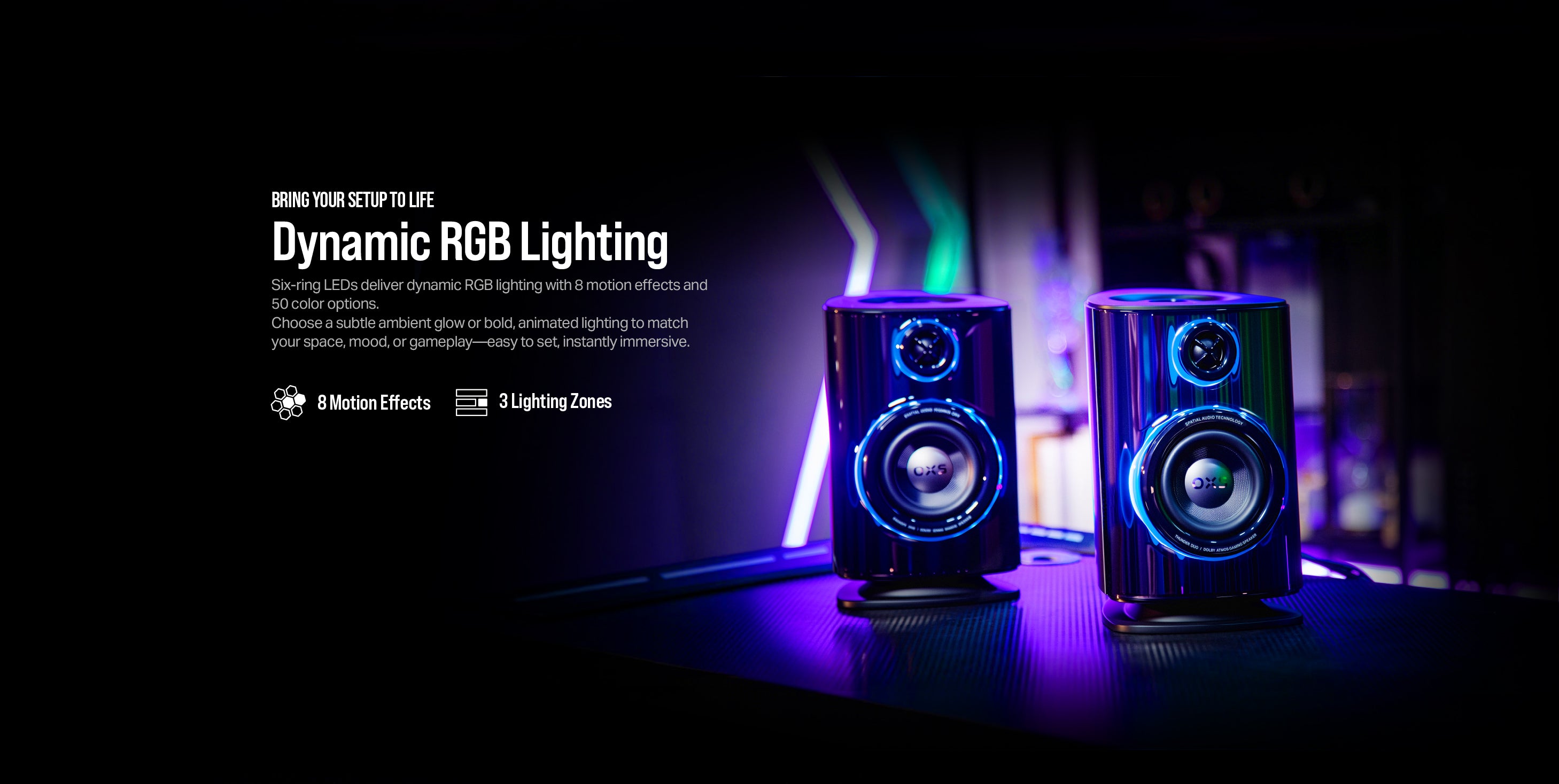 The Thunder Duo Max elevates gaming audio with true Dolby Atmos®, studio-grade precision, and wireless freedom in a compact, future-ready design. Powered by the Dolby Atmos®, its upward-firing Sky Channels deliver lifelike vertical sound and immersive clarity. In games, creation work, and live streaming, Thunder Duo Max creates a larger and more consistent soundfield than conventional desktop setups.